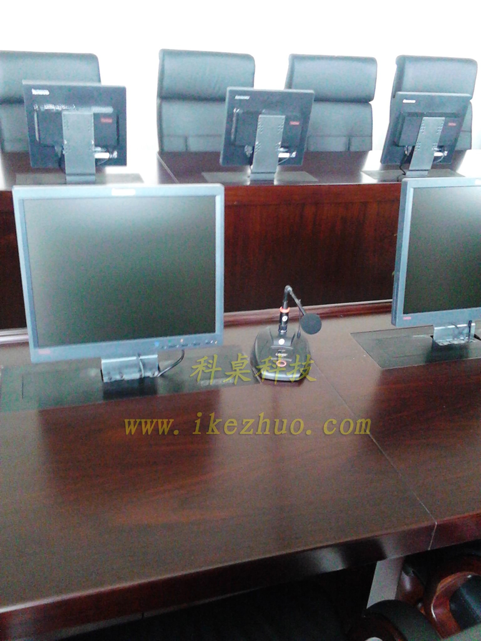 當(dāng)需要舉行會(huì)議時(shí)隱藏在會(huì)議桌內(nèi)的升降器把液晶顯示器從會(huì)議桌下面自動(dòng)升到桌面并仰成一定角度,